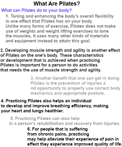 1.What Are Pilates Although one of the effects of Pilates on the body is toning and strengthening your overall flexibility, people who practice Pilates does not allow the use of an elevator to get this effect exercises What Are Pilates. There are other types of equipment that are used by people who practice What Are Pilates achieve a well toned and better flexibility.yoga Pilates
